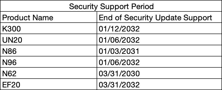 We state that the defined support period for the product above is for up to three years after the end-of-production date which is the same as when we first supplied it. Any update will be published below,